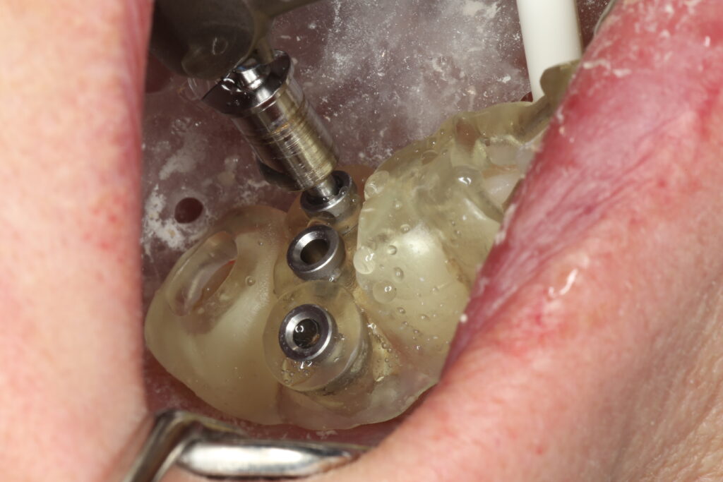 Should primary stability not be achieved, the custom healing abutment will be placed. Upon integration of the implant, the custom healing abutment is replaced with the final custom abutment. Adjustments to the margin can be made if needed and the case is then scanned with the IOS as if it is a crown preparation.