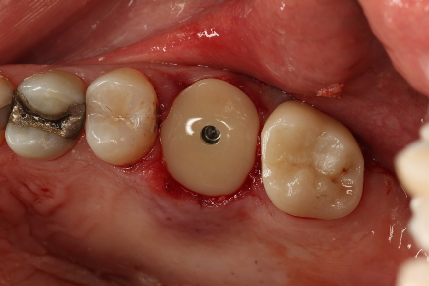 With qualifying torque and ISQ values, the final custom abutment and temporary crown are placed. Should the torque and ISQ values be too low, the custom healing abutment can be placed. The final custom abutment and temporary crown will be placed after integration.